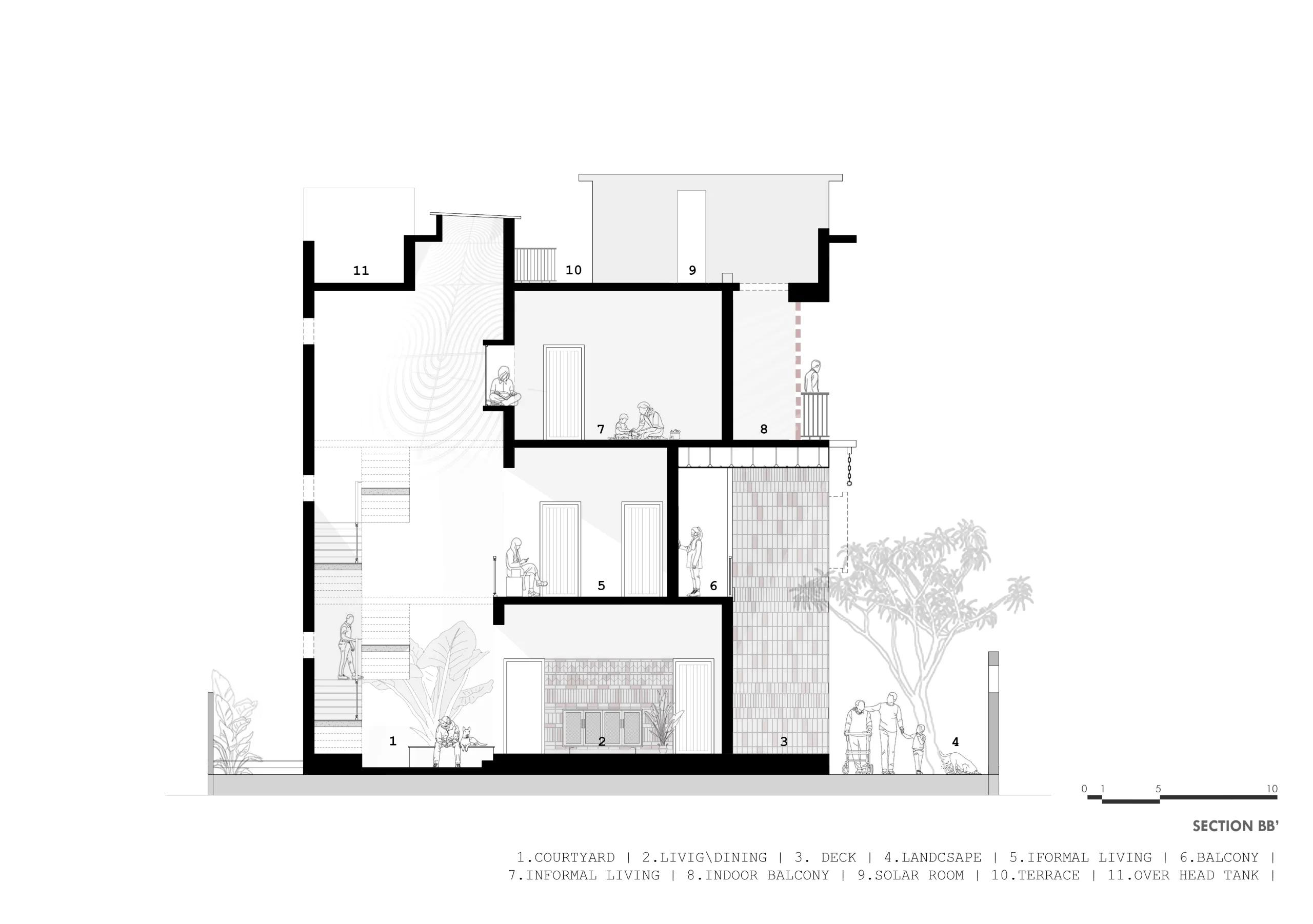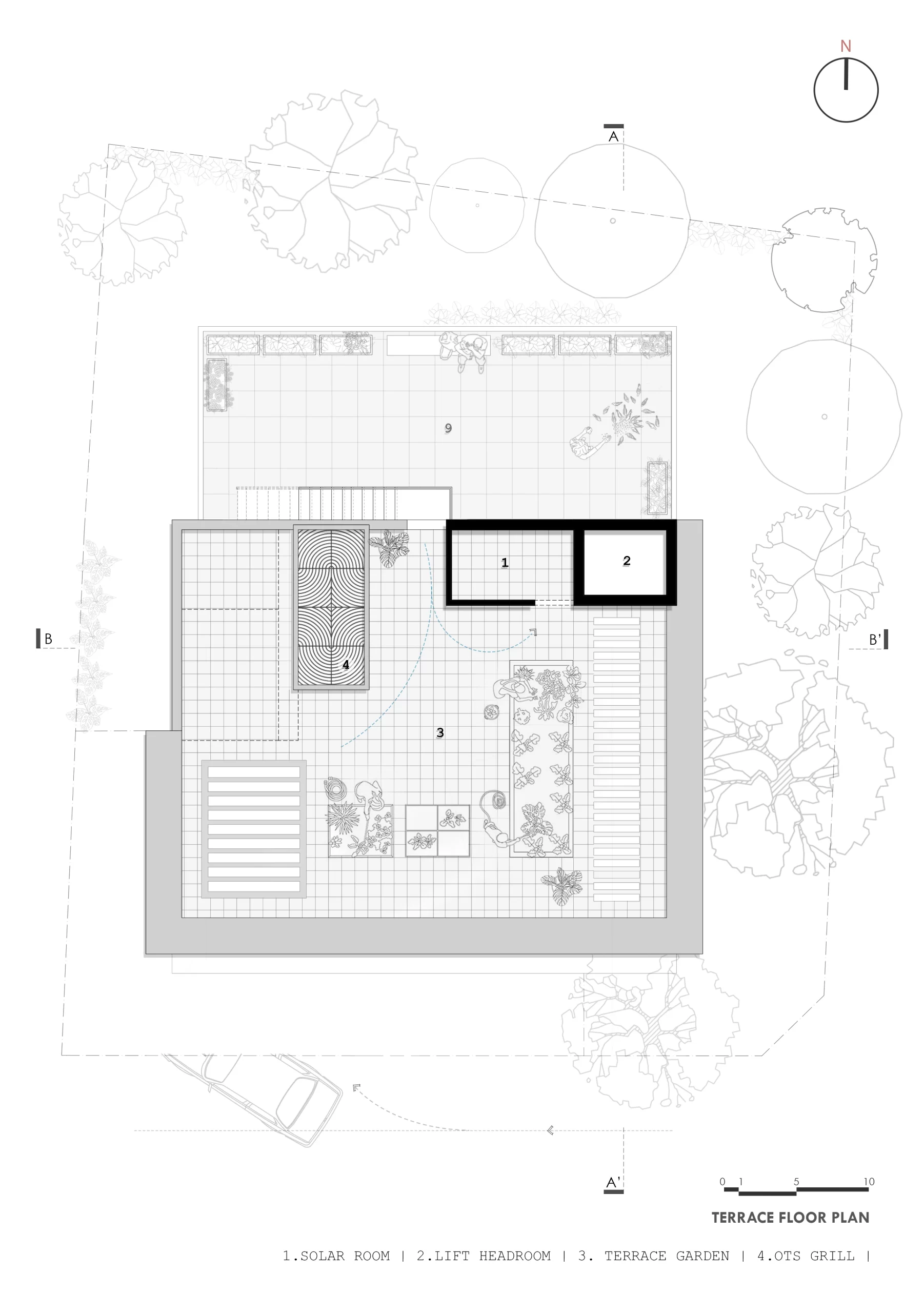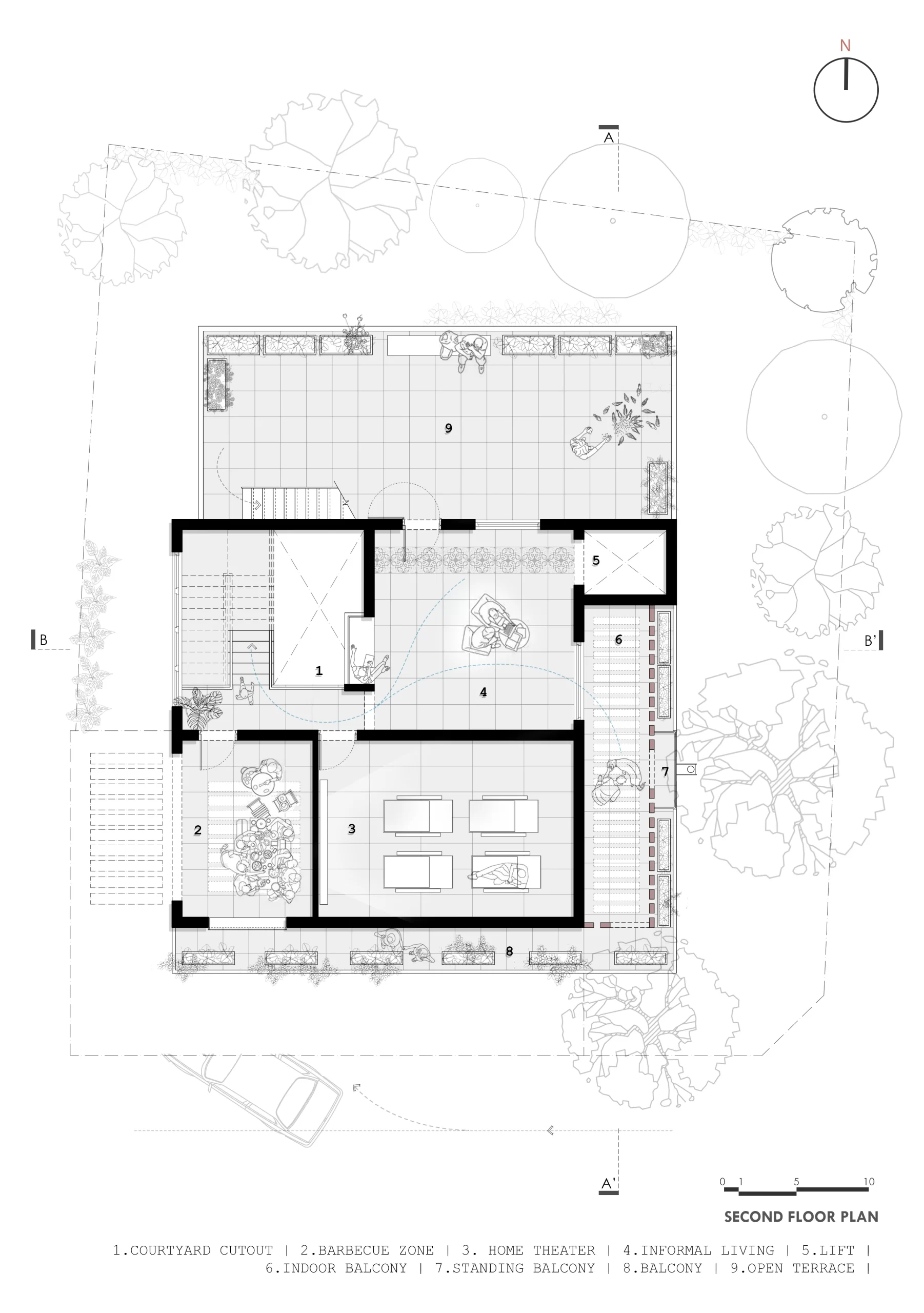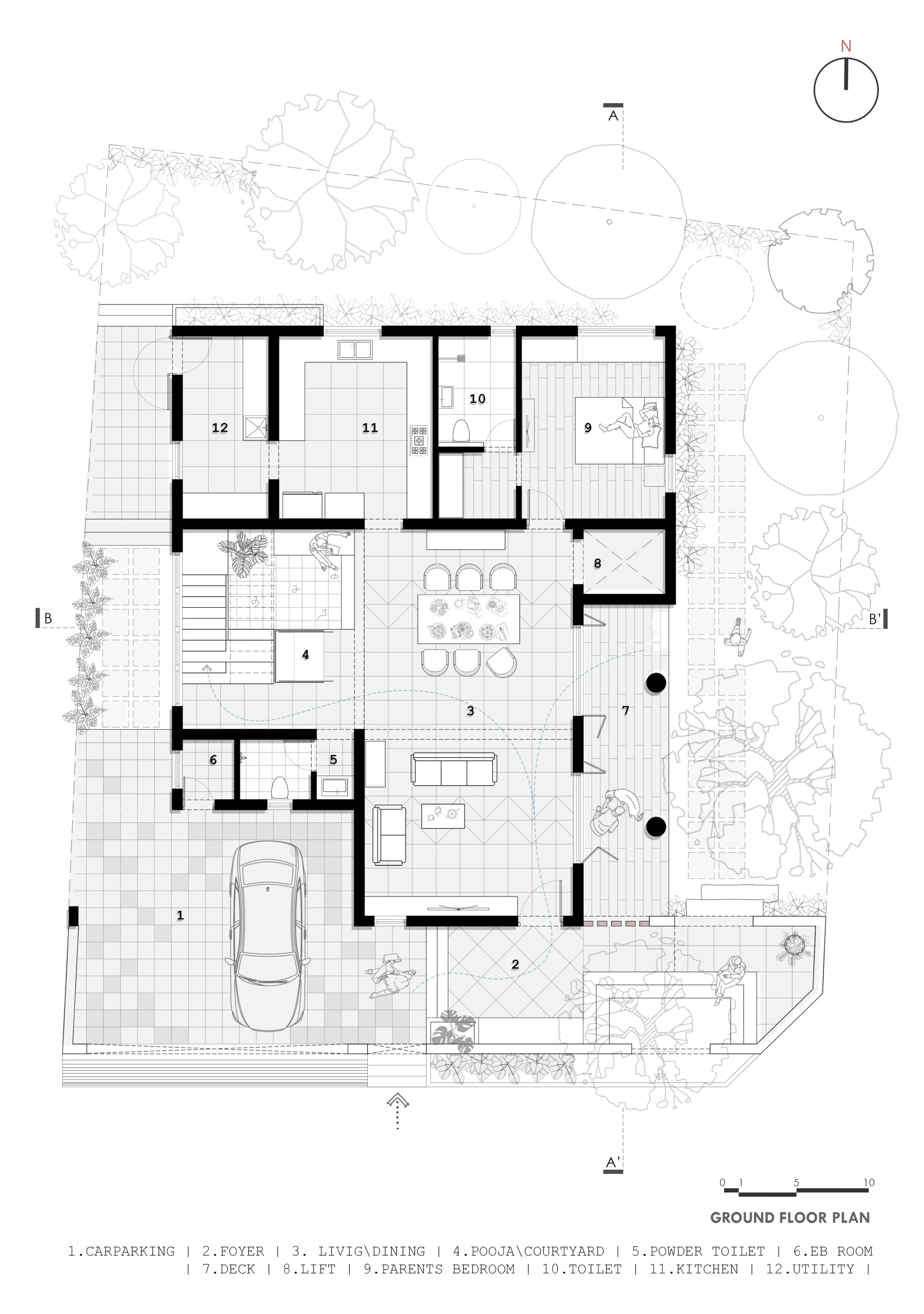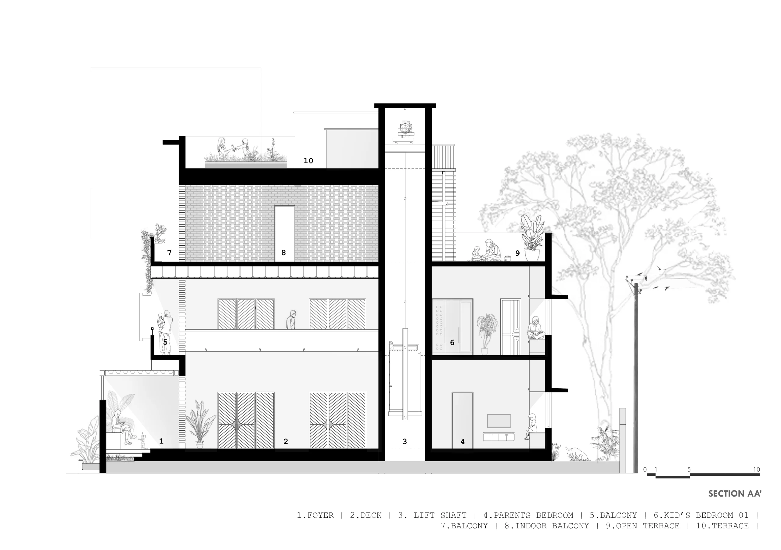 Every major design decision responds to the trees, shaping the layout into two distinct east-west longitudinal zones. The western edge functions as a thermal and visual buffer—housing services such as parking, staircase, utilities, wardrobes, toilets, and a barbecue terrace—while shielding the interiors from harsh western sun and street exposure.