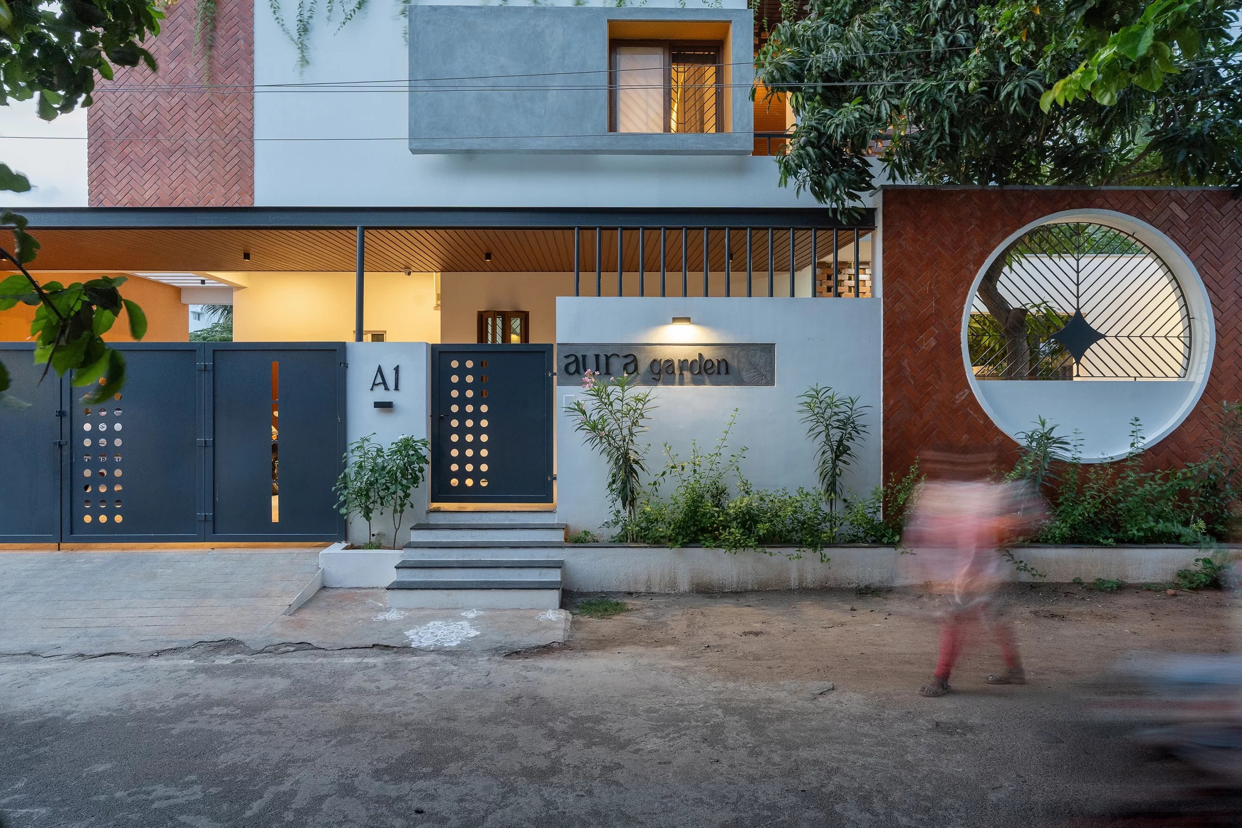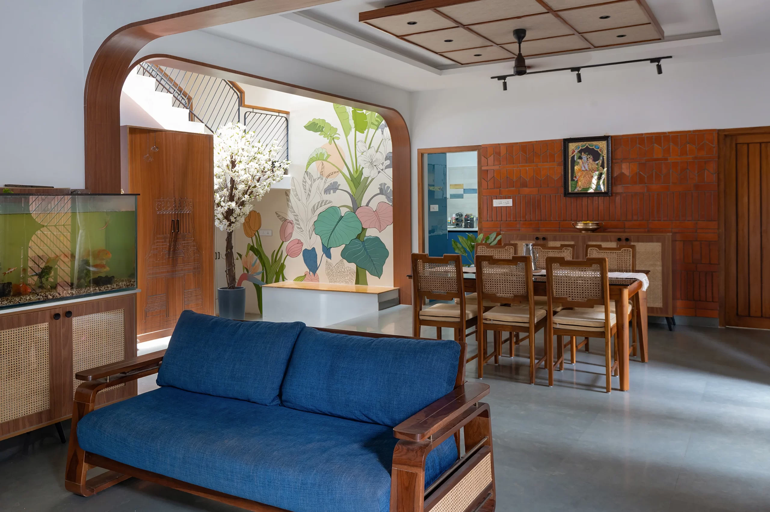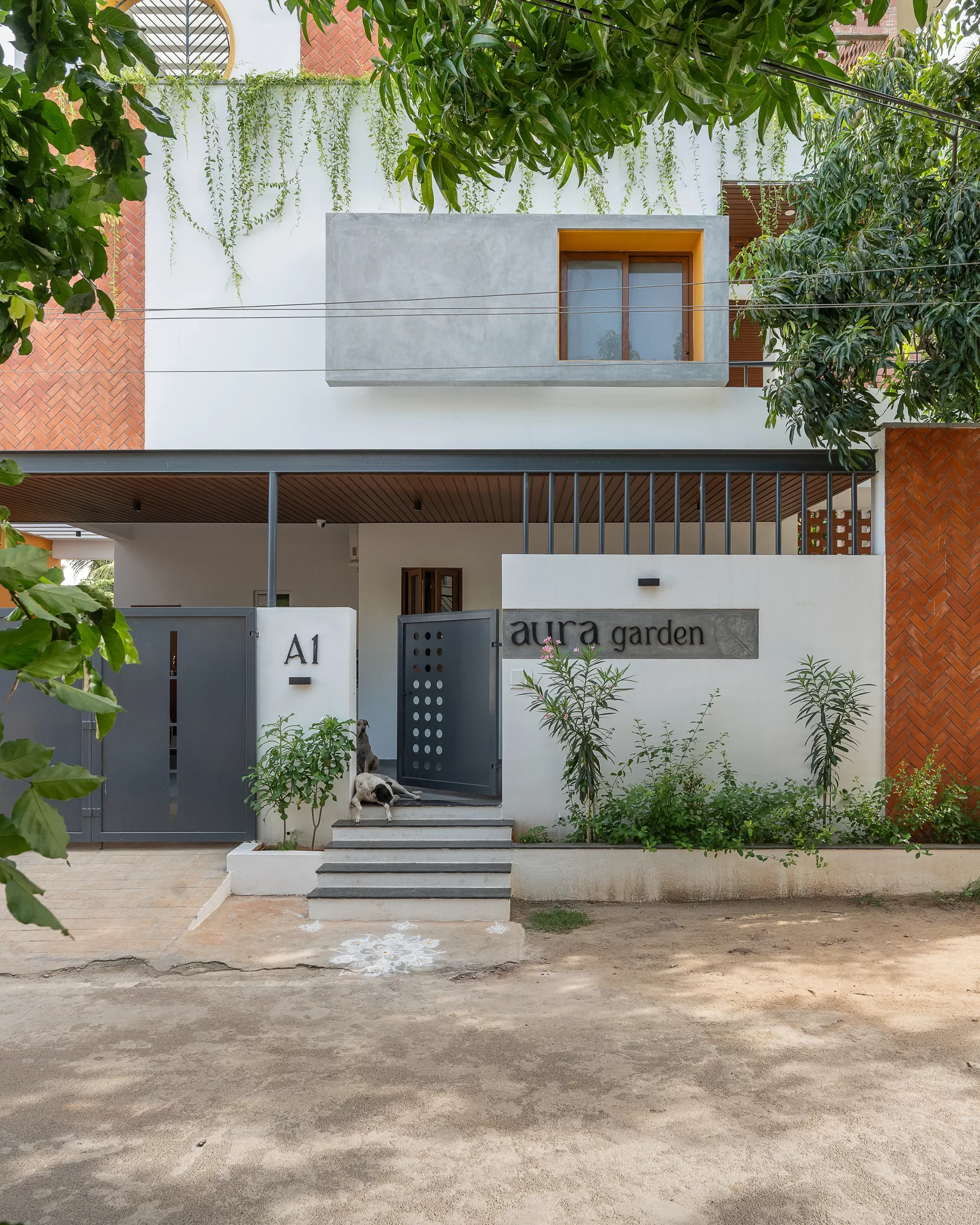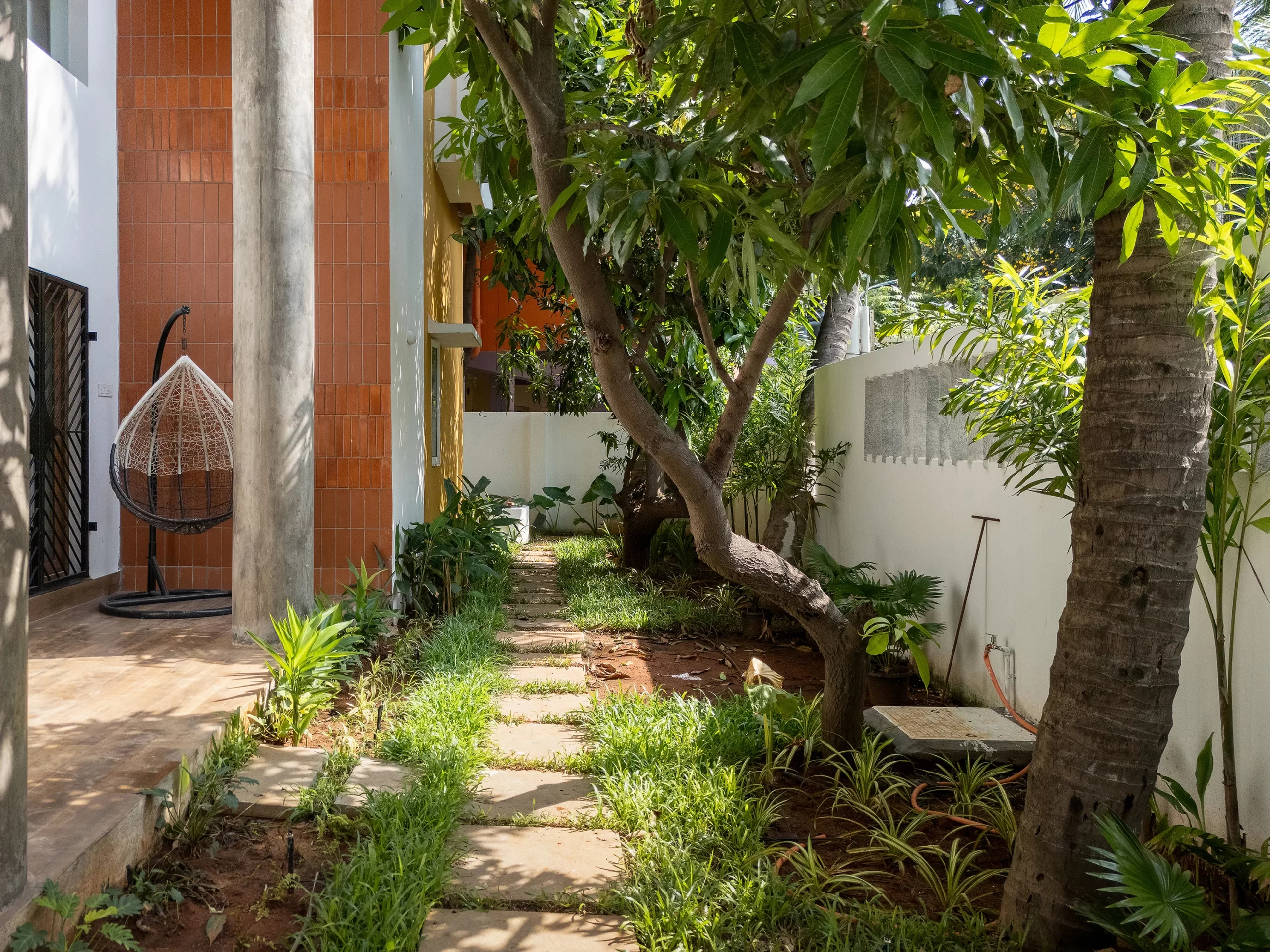 Rather than a manicured landscape, the garden thrives as a DIY, evolving ecosystem, nurtured by the grandfather. The courtyard mural and foyer walls extend this landscape indoors, transforming blank surfaces into vibrant expressions of memory and life.