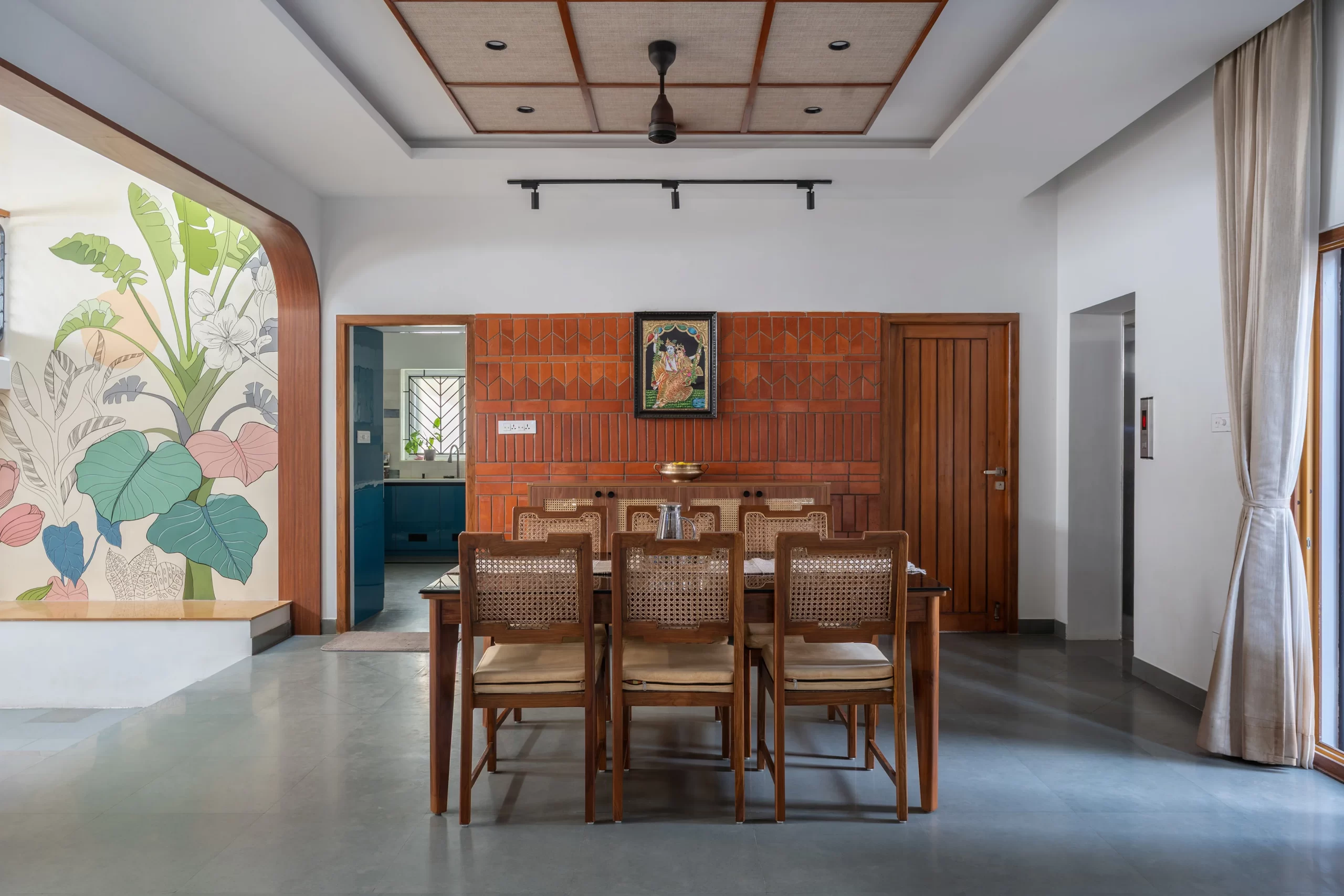 At the heart of the home is a triple-height courtyard, around which the staircase wraps like a sculptural spine. Crowned with a skylight, this luminous vertical void is animated by a hand-painted tropical mural, reflecting the vibrancy of the garden within the interior walls. A built-in bench here offers a quiet pause with framed views of foliage, while a prayer alcove placed under another skylight ensures soft natural light for daily rituals—a cherished space for the family’s matriarch.