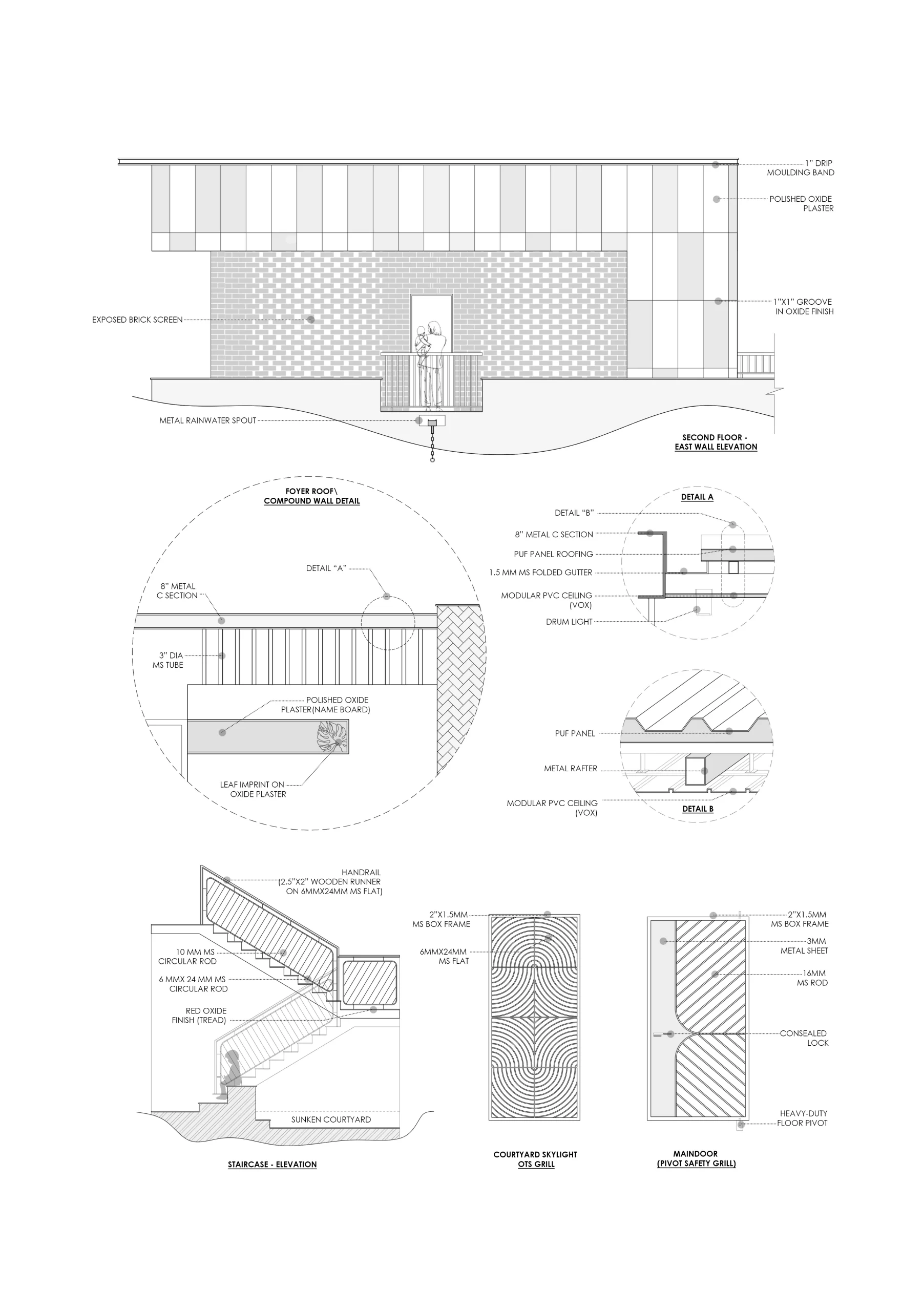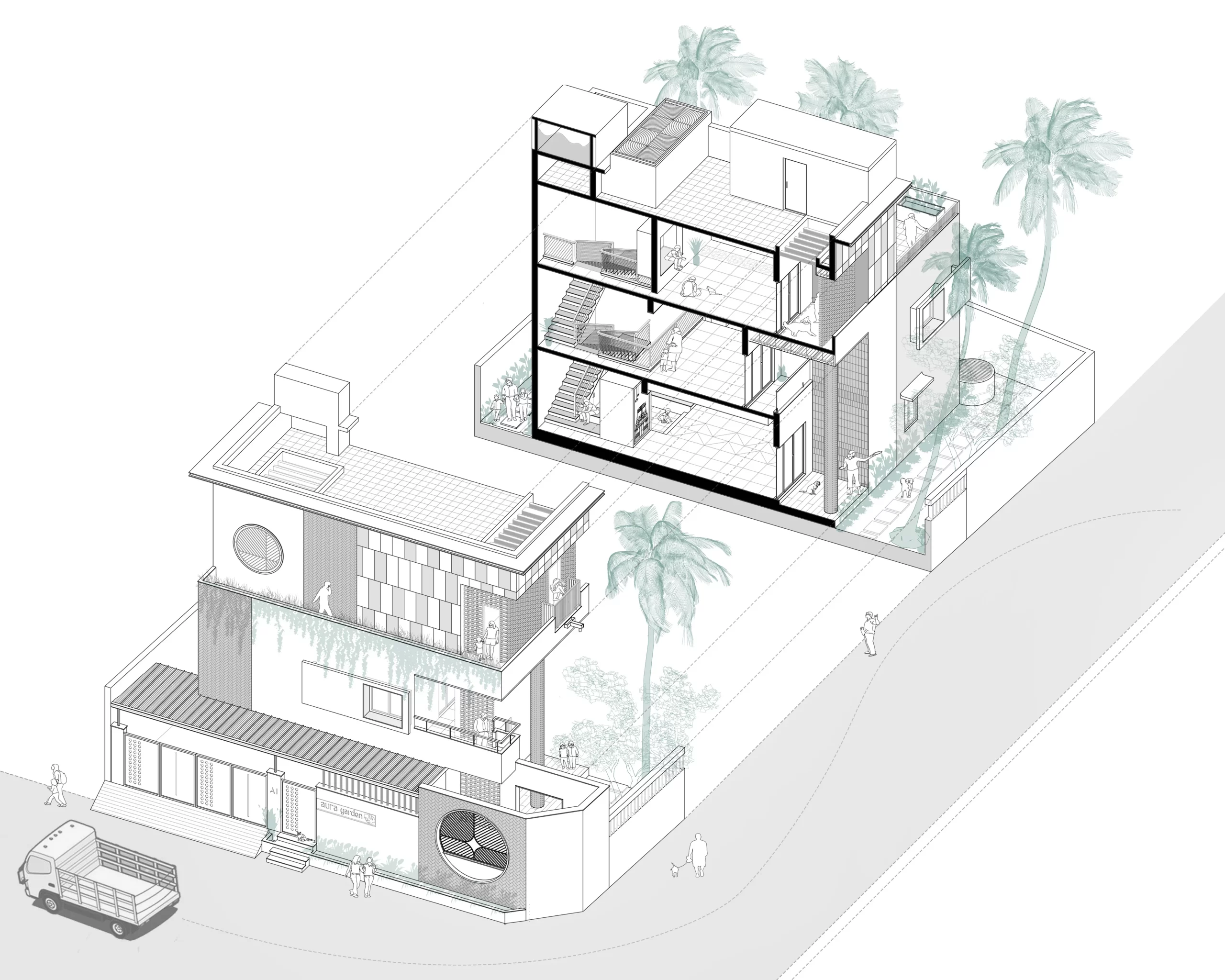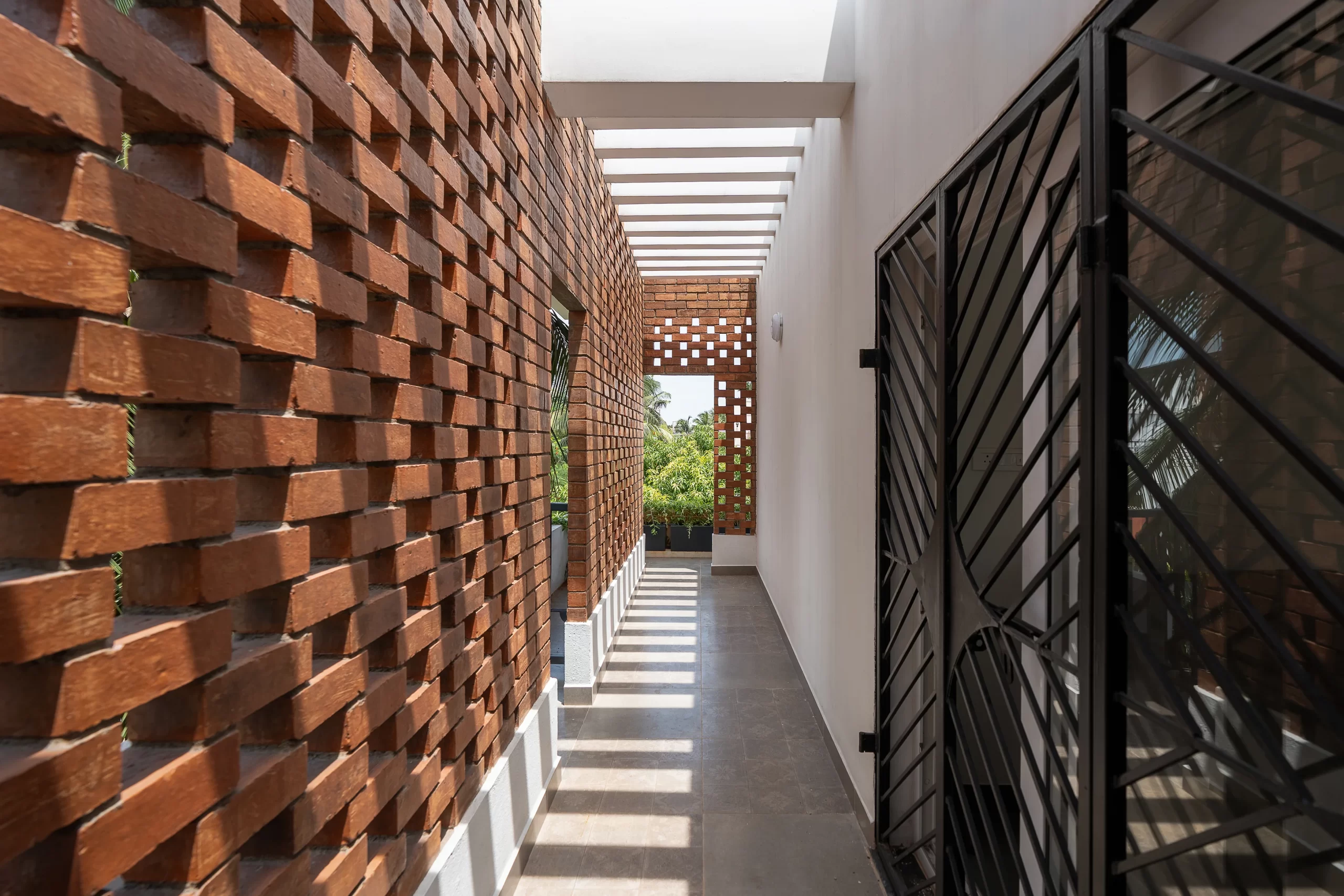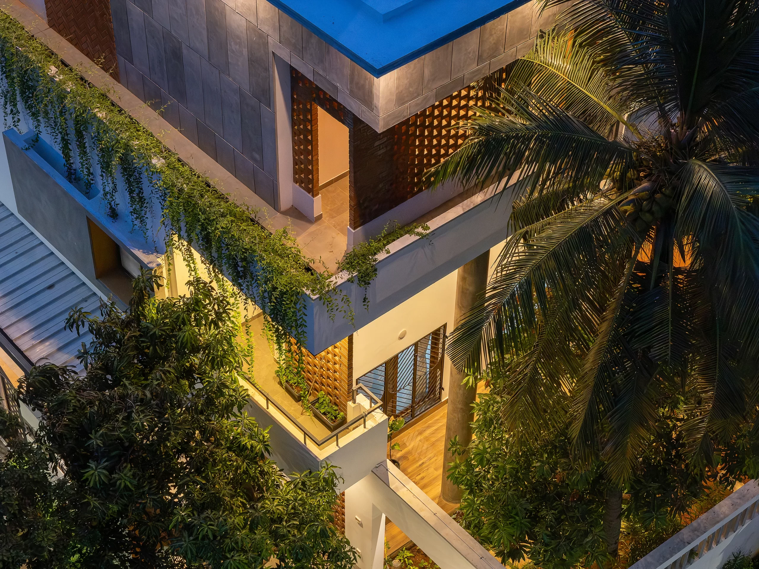 The spatial narrative unfolds vertically. The ground floor remains grounded to the earth, holding the parents’ suite, kitchen, dining, and living spaces, all connected to shaded garden edges. The first floor hosts the master bedroom, two bedrooms for the children, and a cozy family lounge that spills onto a balcony overlooking the garden canopy. Below this, a double-height deck creates a shaded outdoor room nestled between mango and coconut trees—an everyday retreat. The second floor introduces leisure and openness, with a home theatre and two terrace gardens—one for calm relaxation, the other for playful activity.A jaali-lined green corridor and pergola animate this level while doubling as a pet shelter and even a basketball court.